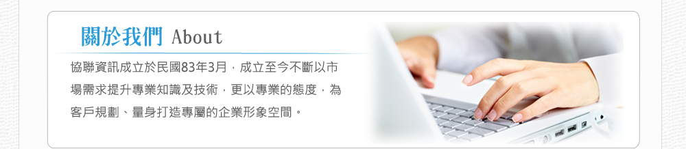 協聯資訊成立於民國83年3月,成立至今不斷以市場需求提升專業知識及技術,更以專業的態度,為客戶規劃、量身打造專屬的企業形象空間。